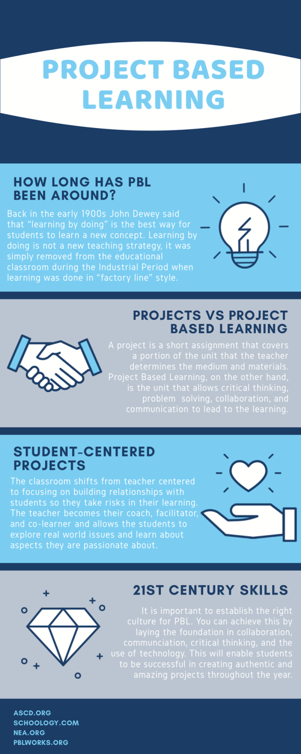 I have created a few infographics to share what I have learned so far about PBL. Feel free to download and share! The first image shares the origin of PBL and why it is an important style of learning that should be used in the 21st century classroom.